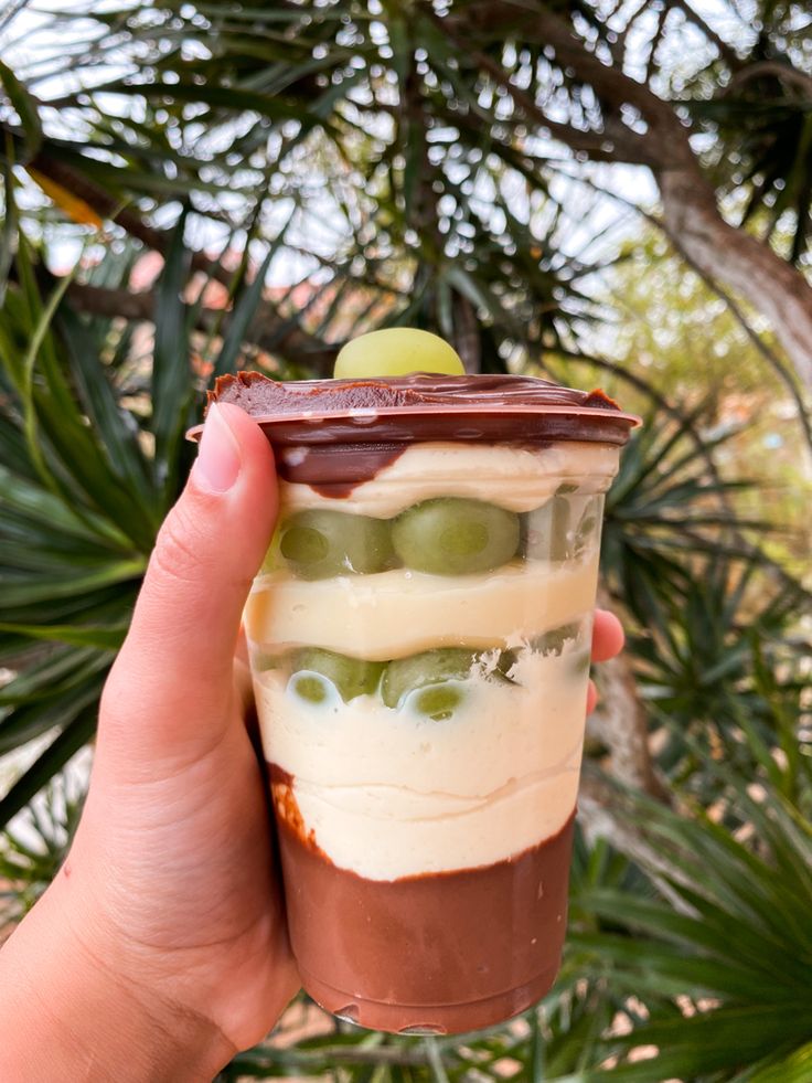 Copo recheado com uvas verdes sem caroço, creme de chocolate, creme de brigadeiro branco e bolacha triturada.